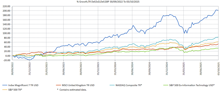 As the chart below shows, over the three years to 3/10/25, the S&P 500 delivered a total return of 62.3 per cent in GBP terms. Yet strip out the technology sector, and that return is halved to 32.8 per cent — well below the 52.8 per cent return from the MSCI United Kingdom index, which has been out of favour with UK investors in recent years.
