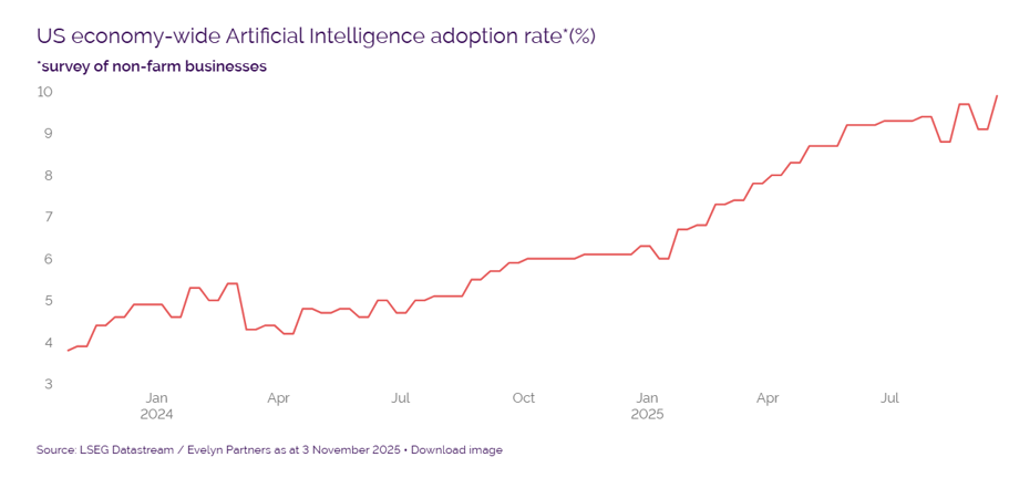 Without a significant ramp-up in grid capacity and generation—especially in regions hosting hyperscaler data centre—the pace of AI adoption could slow. Investors are increasing recognising that the AI boom is linked to the ability of the energy sector to keep up with its power-hungry needs. However, for now it seems that the AI adoption rate in the US economy continues to creep up.