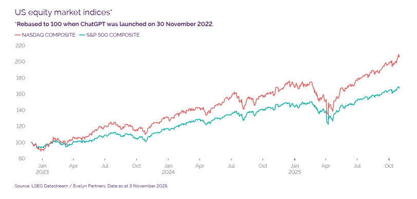 The boom in AI has dominated headlines and equity market performance. Some of the numbers are staggering. Since ChatGPT (a conversational tool powered by AI) was launched on 30 November 2022, the US tech heavy NASDAQ composite has doubled to add $18 trillion in market value, far outstripping the performance of the broader S&P 500 index.1 This index includes all the major players in the AI theme, including Alphabet (the parent of Google and YouTube), Meta Platforms (the owner of Facebook and Instagram), Amazon, Oracle, Microsoft, and chip designer Nvidia.