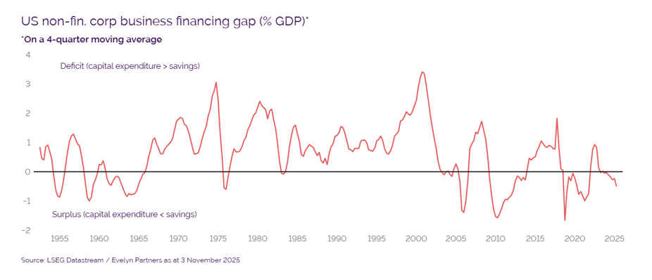 Critically, the finances of US non-financial corporates today are in rude health compared to 25 years ago. The difference between cash flows and capital expenditures (known as the corporate financing gap) shows a 0.5% of GDP surplus. In contrast, when the dot-com bubble burst in 2000, such US firms were running at a 3.4% of GDP deficit.7 Essentially, financing should not be a constraint on the AI investment cycle itself.